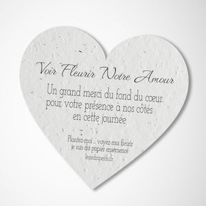 Faites plaisir à vos invités et les remercier d’avoir participé au plus beau jour de votre vie avec un cadeau écoresponsable et unique. Le cœur est fabriqué à partir de papier ensemencé, une fois plantée il se transforme en fleurs! Un souvenir inoubliable de votre mariage. Personnalisez le cœur à planter avec les prénoms des jeunes mariés, la date du mariage et un petit message. Une décoration de table de mariage écologique, originale et magique!
