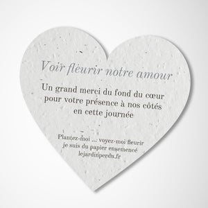 Faites plaisir à vos invités et les remercier d’avoir participé au plus beau jour de votre vie avec un cadeau écoresponsable et unique. Le cœur est fabriqué à partir de papier ensemencé, une fois plantée il se transforme en fleurs! Un souvenir inoubliable de votre mariage. Personnalisez le cœur à planter avec les prénoms des jeunes mariés, la date du mariage et un petit message. Une décoration de table de mariage écologique, originale et magique!