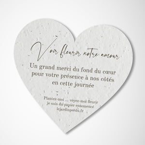 Faites plaisir à vos invités et les remercier d’avoir participé au plus beau jour de votre vie avec un cadeau écoresponsable et unique. Le cœur est fabriqué à partir de papier ensemencé, une fois plantée il se transforme en fleurs! Un souvenir inoubliable de votre mariage. Personnalisez le cœur à planter avec les prénoms des jeunes mariés, la date du mariage et un petit message. Une décoration de table de mariage écologique, originale et magique!