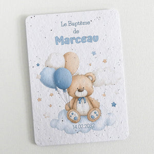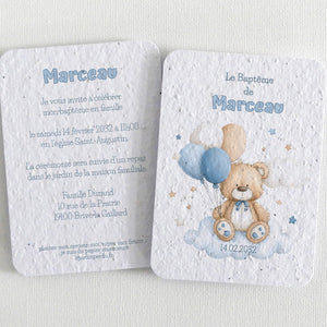 Our eco-friendly baptism invitations are made from seed paper, recycled paper embedded with flower seeds. Following the special day your guests can plant their environmentally friendly invitation in a pot where it will bloom into a beautiful array of flowers. An extra special souvenir of your child's baptism