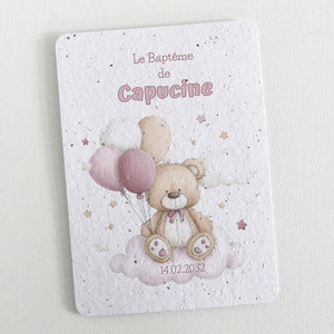 Plantable Baptism Invitation - Pink Teddy Bear 12.8cm x 17.9cm